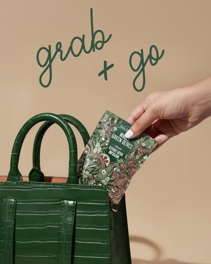teta's olives, close up, classic citrus herb infusion snack bag, in hands against a nature background