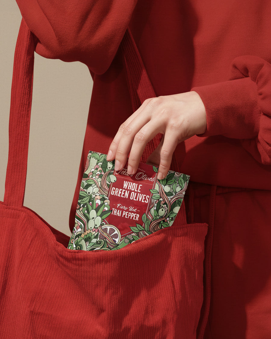 Close-up of Teta’s Olives Fiery Hot Thai Pepper pouch being torn open, set against a light blue background with Teta’s Olives logo in the bottom left. Perfectly designed for on-the-go spicy olive snacks with premium all-natural ingredients