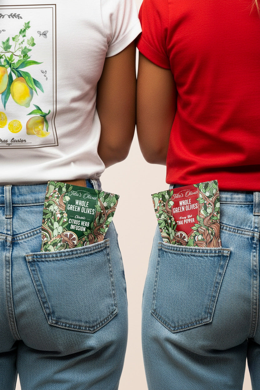 The variety pack offers two bold flavors in one delicious box, 3 bags of each of our best-selling flavors. Enjoy the refreshing Citrus Herb olives, marinated with bright lemons, aromatic bay leaves, and sea salt for a savory bite, or turn up the heat with the Fiery Hot Thai Pepper, infused with yellow and red thai peppers for a spicy kick.